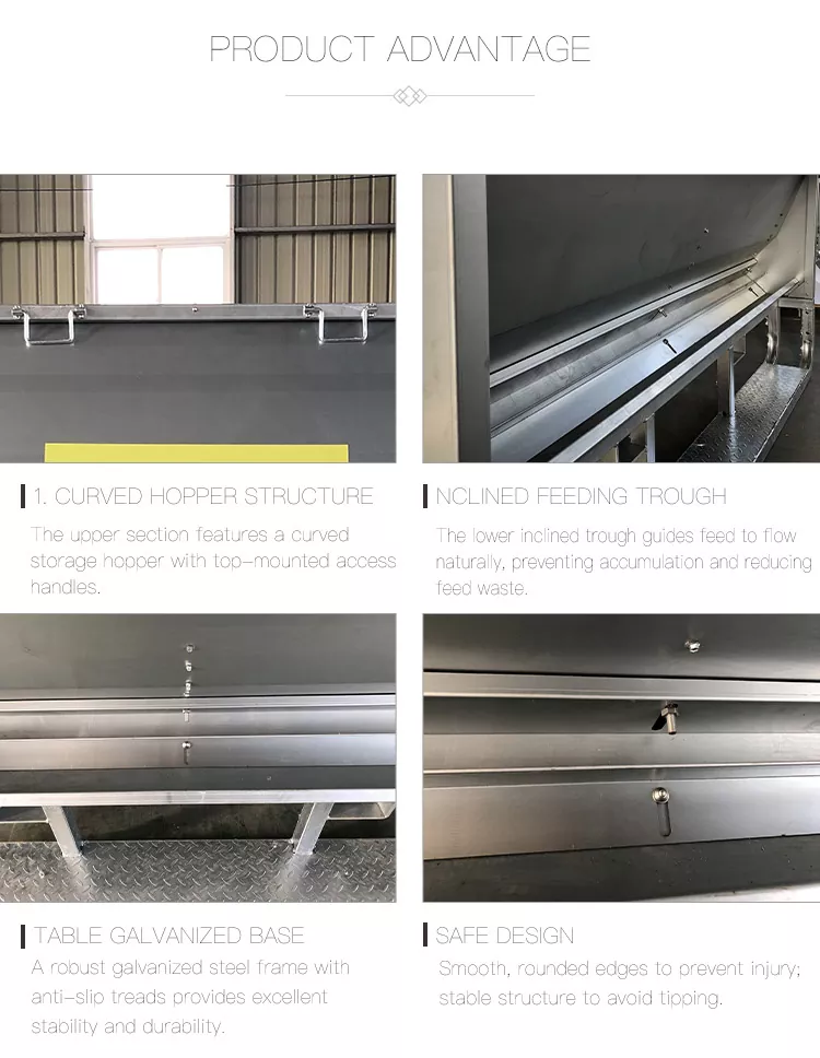 2. వంపుతిరిగిన ఫీడింగ్ ట్రఫ్: దిగువ వంపుతిరిగిన ట్రఫ్ గైడ్లు సహజంగా ప్రవహించేలా ఫీడ్ చేస్తాయి, పేరుకుపోకుండా మరియు మేత వ్యర్థాలను తగ్గిస్తాయి.